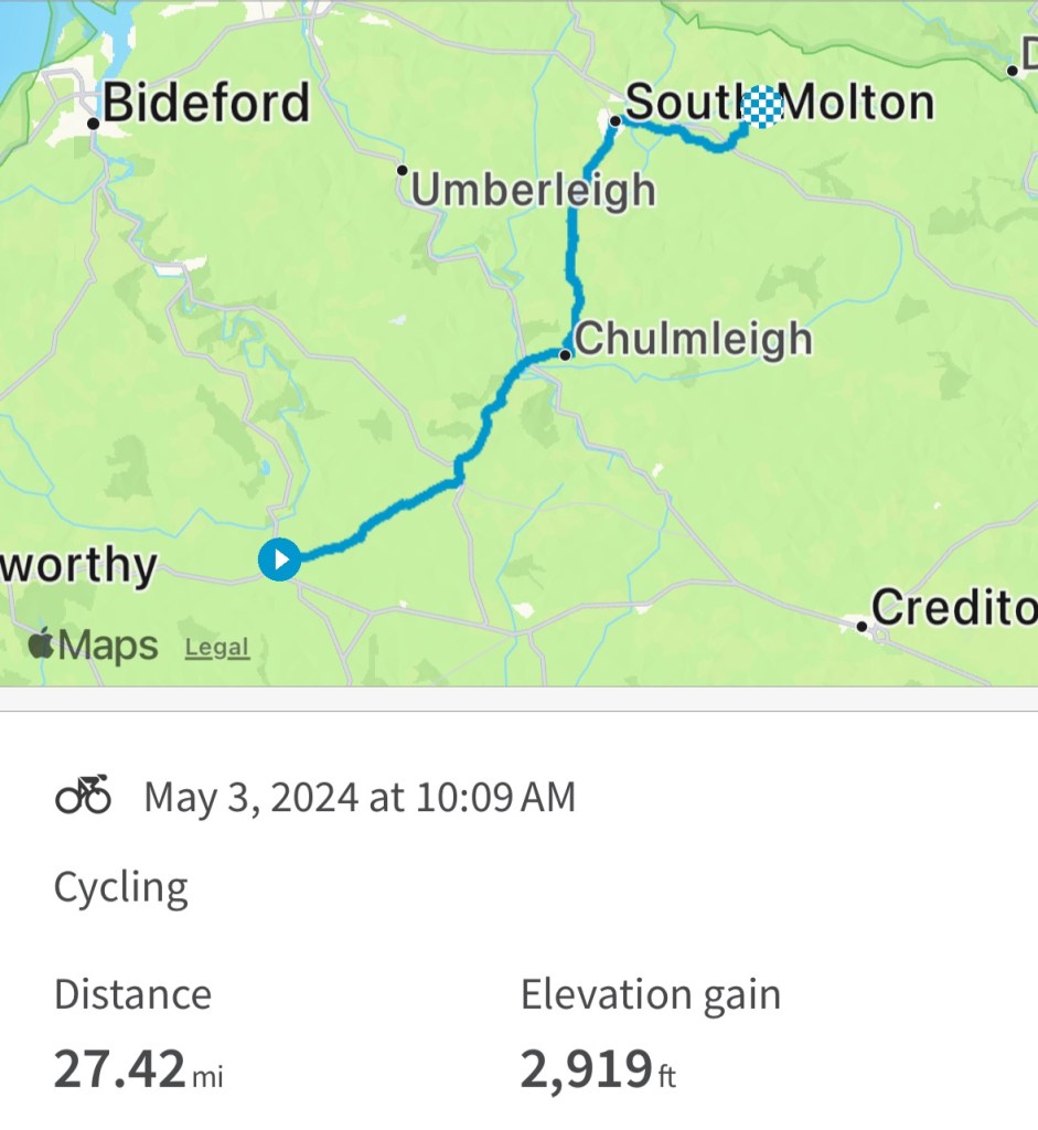 The ride was hilly through beautiful countryside on small roads with some steep climbs. I stopped in the little village of Winkleigh for a coffee and passed through tiny villages of Monkokehampton and Berner’s Cross, George Nympton, and a number of other villages all named ‘Cross’, as well as the larger town of Chulmleigh.