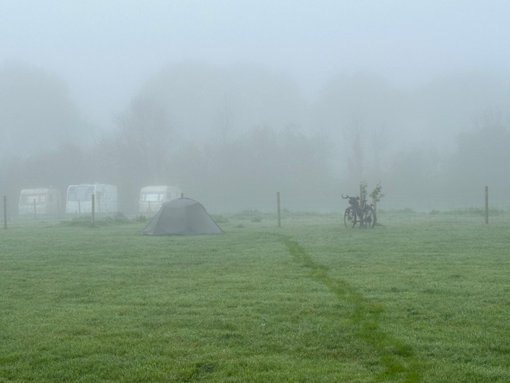On Wednesday May 8th, I woke around 5am to a very foggy and wet campsite. I made myself a cup of tea and started to pack up. I realized there was no chance of drying the tent before my departure so I packed it wet and hoped it would be sunny and breezy in the evening. My friends the alpacas were there to wish me bon voyage.