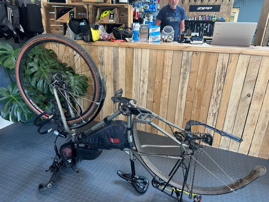 They were too busy to help but suggested I take my rear wheel off and they would have a quick look. Promptly I unloaded the gear and tipped my bike upside down to remove the wheel. It turned out to be a thorn in the tire causing a slow leak. I could have avoided both visits to bikes shops today had I just checked for a puncture in the morning, but I was convinced I had damaged the valve at the campground the night before. 😩