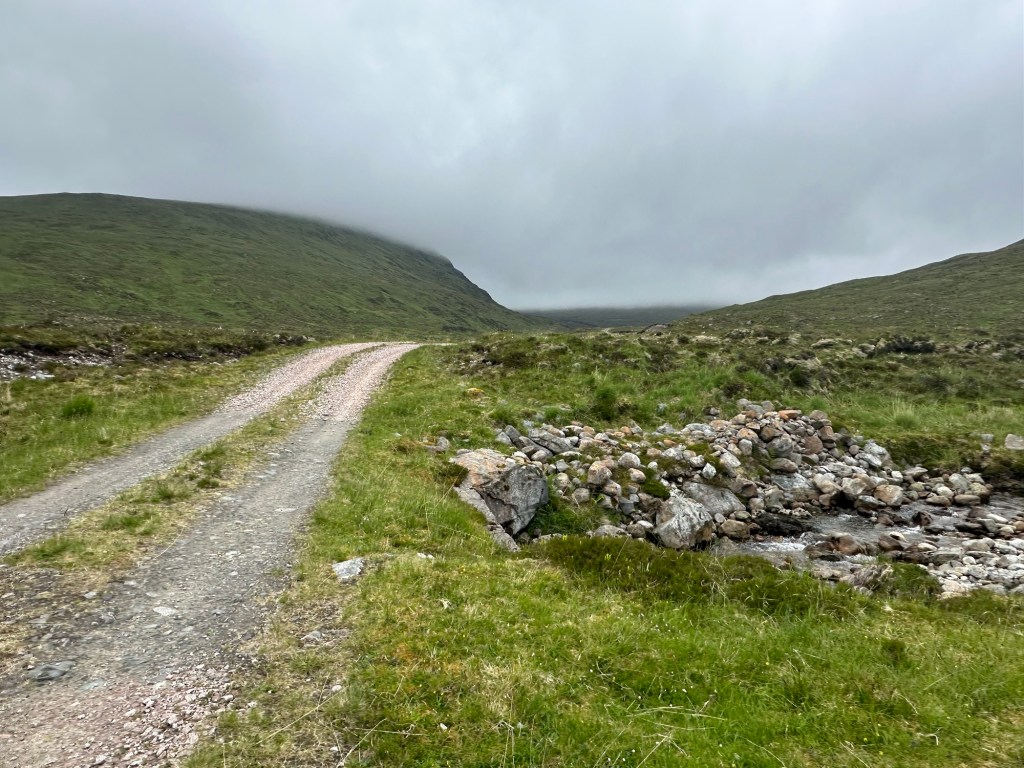 The path started to descend and I eventually passed through a sheep farm and onto a path through a pine forest before reaching the paved but deserted Strathmore Hope Road that goes from Alnaharra up to Ben Hope, the most northerly of the Scottish Munros (defined as a Scottish mountain over 3000ft/914.4m above sea level), and Loch Hope.