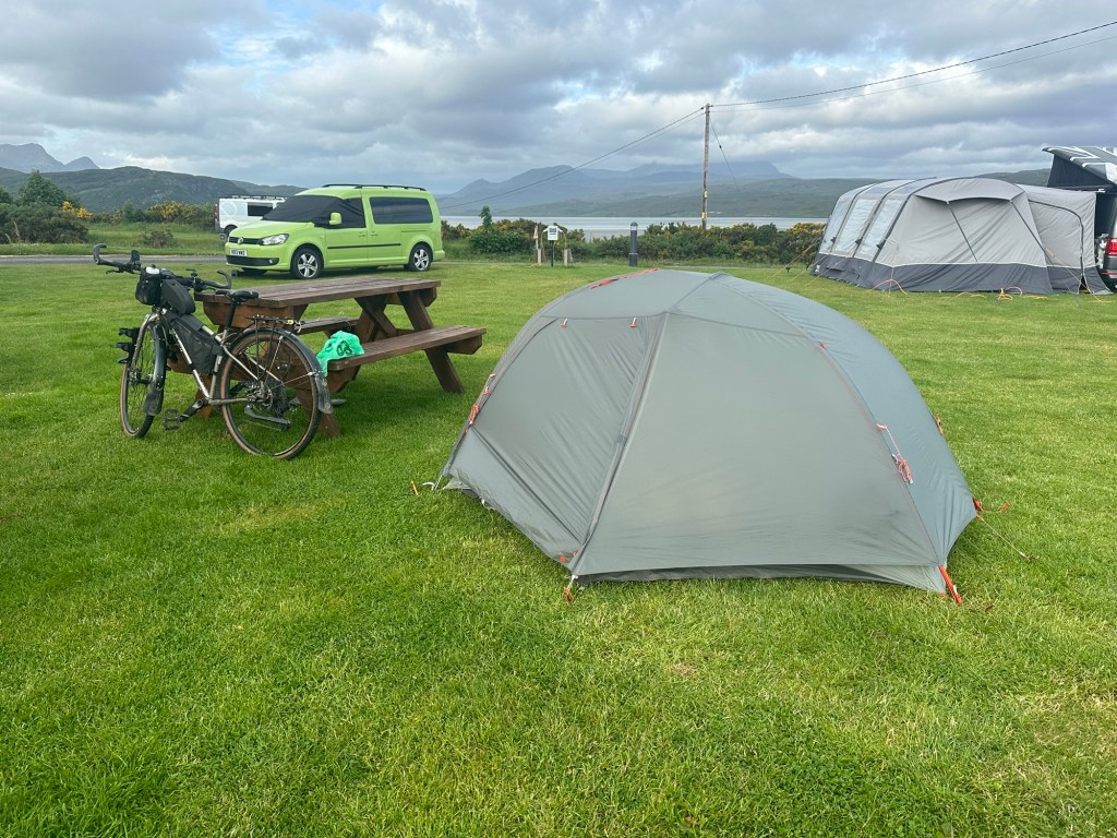 The decision to camp on the lawn of the Achness Hotel was not the best one. Even before the sun went down, the midges came out in swarms, so much so that Jason decided to sleep in his van rather than his tent. I pitched my tent with not an inch of skin exposed while desperately trying to keep midges from getting inside. They are tenacious little buggers so despite my heroic efforts, the following morning I was covered in itchy welts 😡