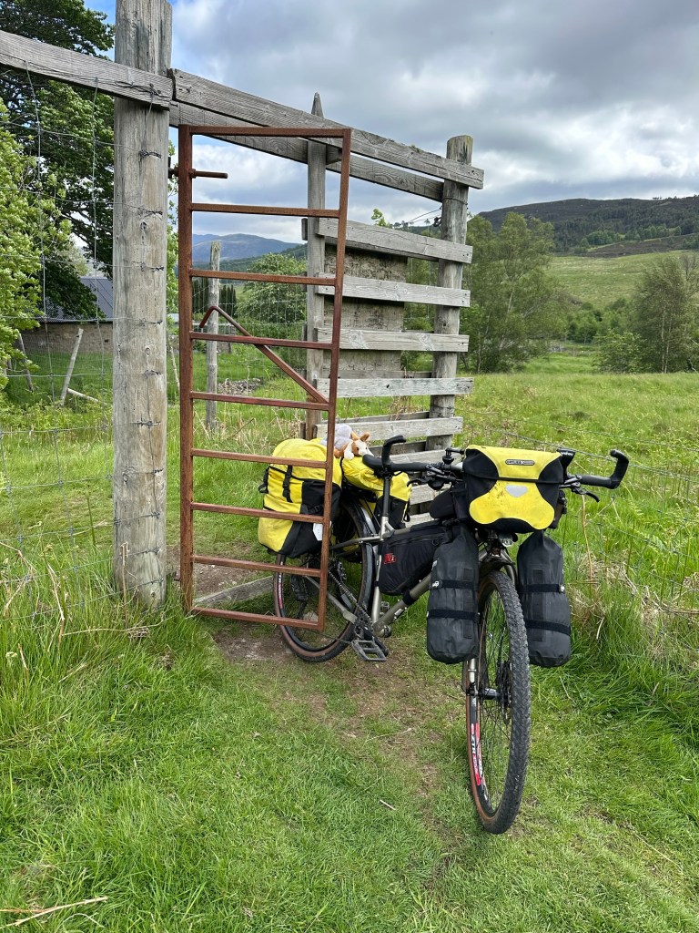 I left Duncan to eat his lunch and continued along the gravel road that soon turned into a muddy path. I didn’t have far to go until I would cross Oykel Bridge and take the paved road into Rosedale but it took ages because of the dreadful condition of the path. As I got closer to civilization, I hit a cell signal and noticed a text from my cousin Jason who was planning to meet me in Rosehall at the end of the day. I stopped to make a quick call to Jason, who told me he had booked a campsite in Lairg and would meet me in the pub at Rosehall for dinner.