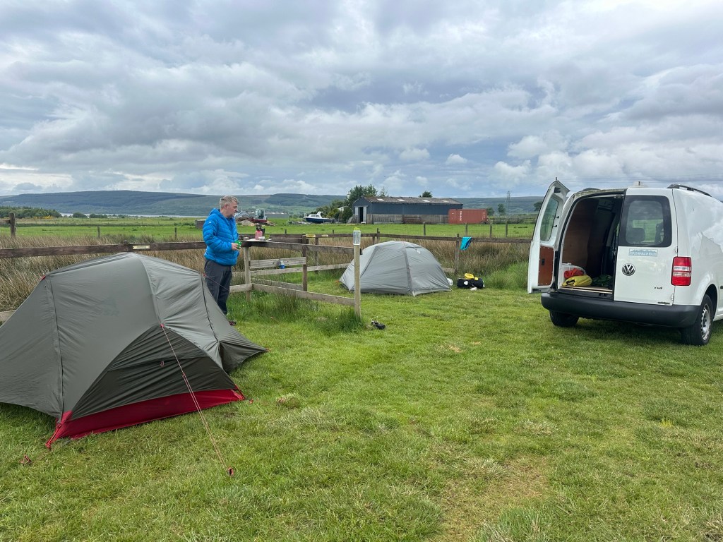 Since there was nothing open in Lairg, we ate dinner at the hotel. Steak and kidney pie with chips for Jason and cheeseburger and chips for me. I was starving! We then headed over to Lairg where Jason had reserved a campsite. We would return to the Achness Hotel in the morning so I could pick up my route.